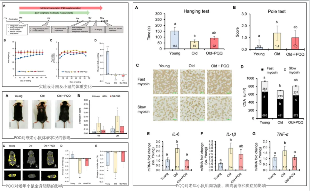 研究人員讓自然衰老的C57BL/6J雄性小鼠分別攝入正常飲食,加或不加PQQ(20 mg/kg/天),持續(xù)10周。通過(guò)生物電阻測(cè)量,在第0周和第8周監(jiān)測(cè)體成分。在第0周、第4周和第8周評(píng)估皮膚狀況。第8周時(shí)檢查肌肉力量和功能。第9周,對(duì)小鼠進(jìn)行計(jì)算機(jī)斷層掃描成像,并收集血液和組織樣本。測(cè)量了腓腸肌中炎癥細(xì)胞因子的水平,并檢查了比目魚(yú)肌中肌纖維的橫截面積。此外,使用D-半乳糖(D-gal)誘導(dǎo)的細(xì)胞衰老模型研究PQQ干預(yù)對(duì)成肌細(xì)胞(C2C12)的細(xì)胞增殖、衰老、分化、活性氧(ROS)水平和線粒體功能的影響。還檢查了D-gal誘導(dǎo)的腸上皮細(xì)胞(IEC6)的細(xì)胞增殖和單層通透性。